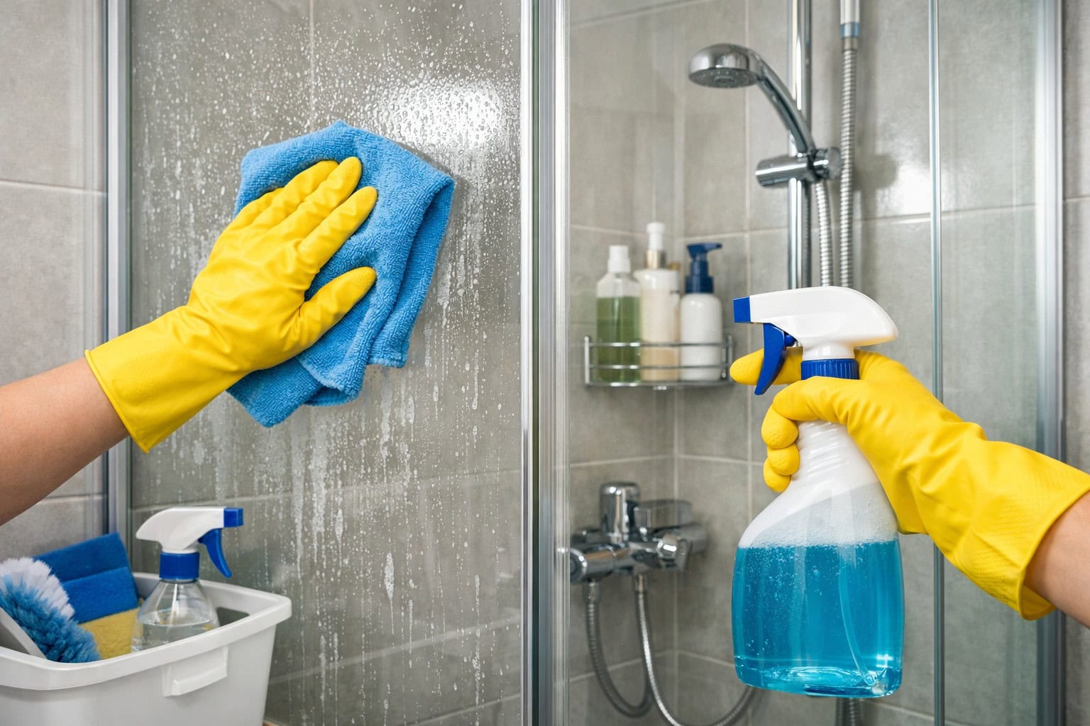 Cleaning glass walls and doorsThe most noticeable problem is white stains from hard water. To shower glass always remain transparent, use products marked “anti-sludge”. Spray on the surface, leave it for a few minutes and then remove any remaining moisture with a scraper. If you prefer eco-friendly methods, a one-to-one solution of table vinegar and water is an excellent solution for muddy stains.