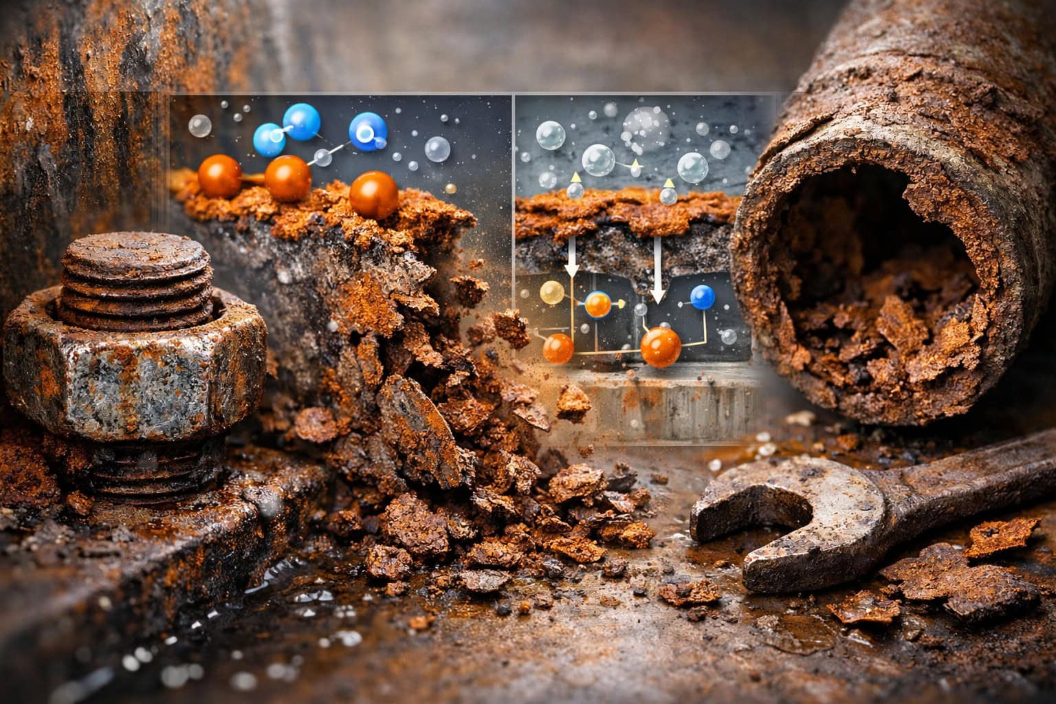 When iron comes in contact with water and oxygen, iron is formed hydrated iron oxide. Unlike patina on copper or oxide film on aluminum, rust has a porous structure. It does not protect the metal, but instead absorbs moisture, allowing corrosion to penetrate deeper into the material structure until the part is completely destroyed.