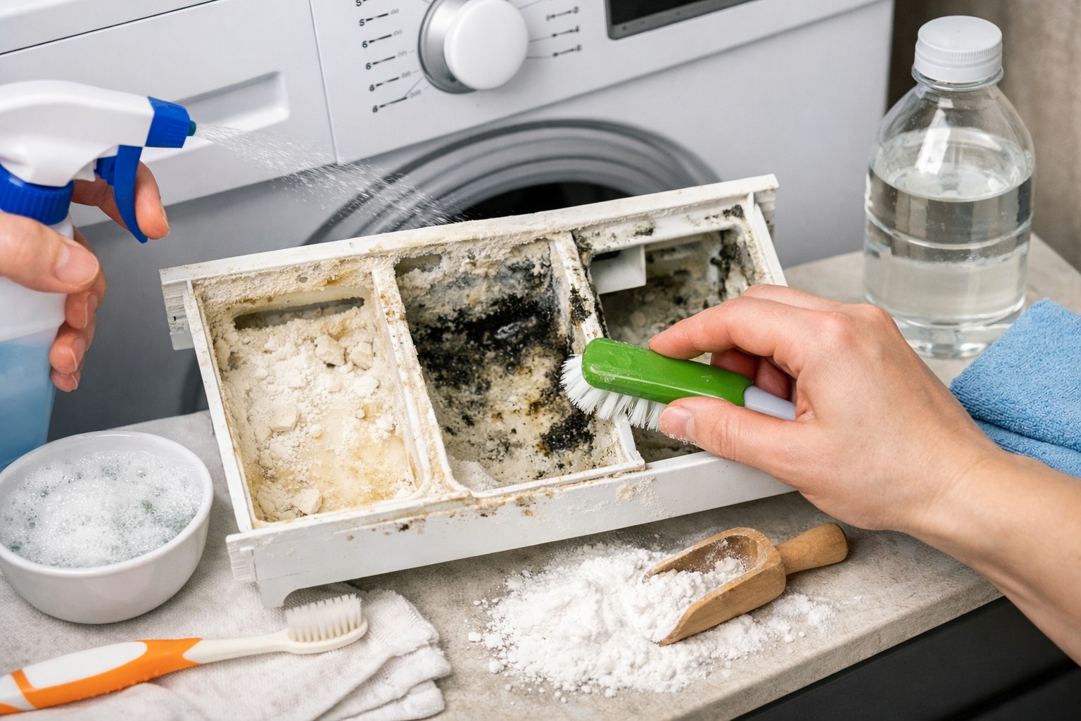 Washing machine cleanliness starts not with the drum, but with the powder receiver. Over time, detergent residue builds up in this small plastic compartment and turns into a tough lime scaleand high humidity provokes the growth of black mold. If you ignore this problem, bad odor and bacteria will get on your clothes during every wash.