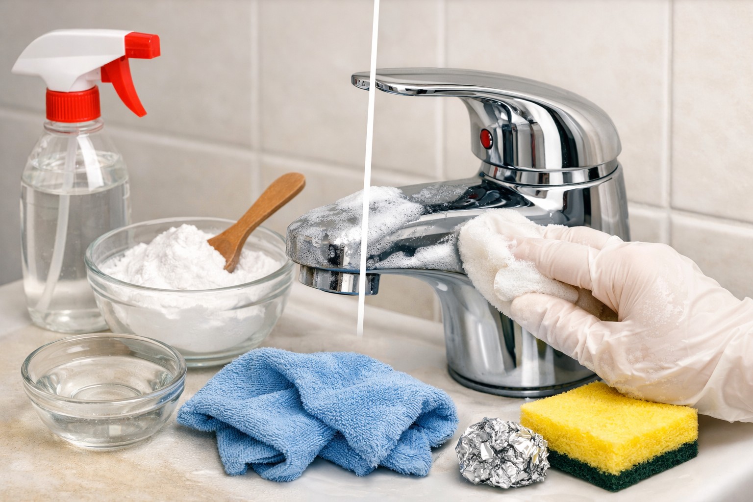 Citric acid solution. This is the safest option for most modern coatings. Simply dilute the powder in warm water and wipe the faucet with a soft cloth.