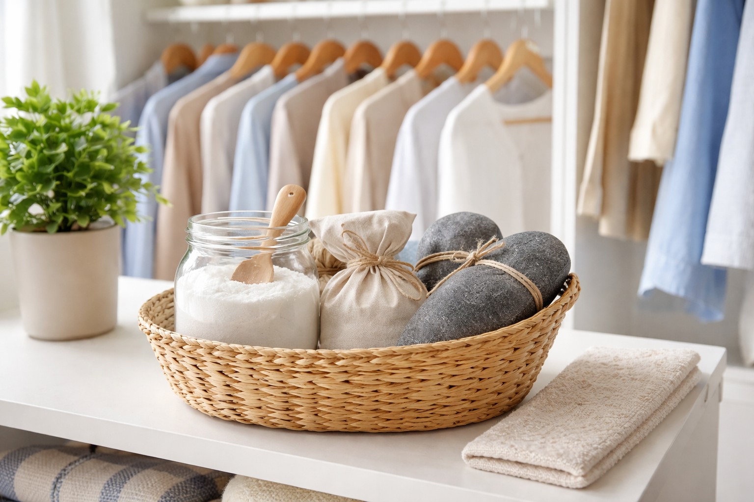 Silica gel. Those same bags from shoe boxes also work great on laundry shelves, preventing the appearance of dampness.