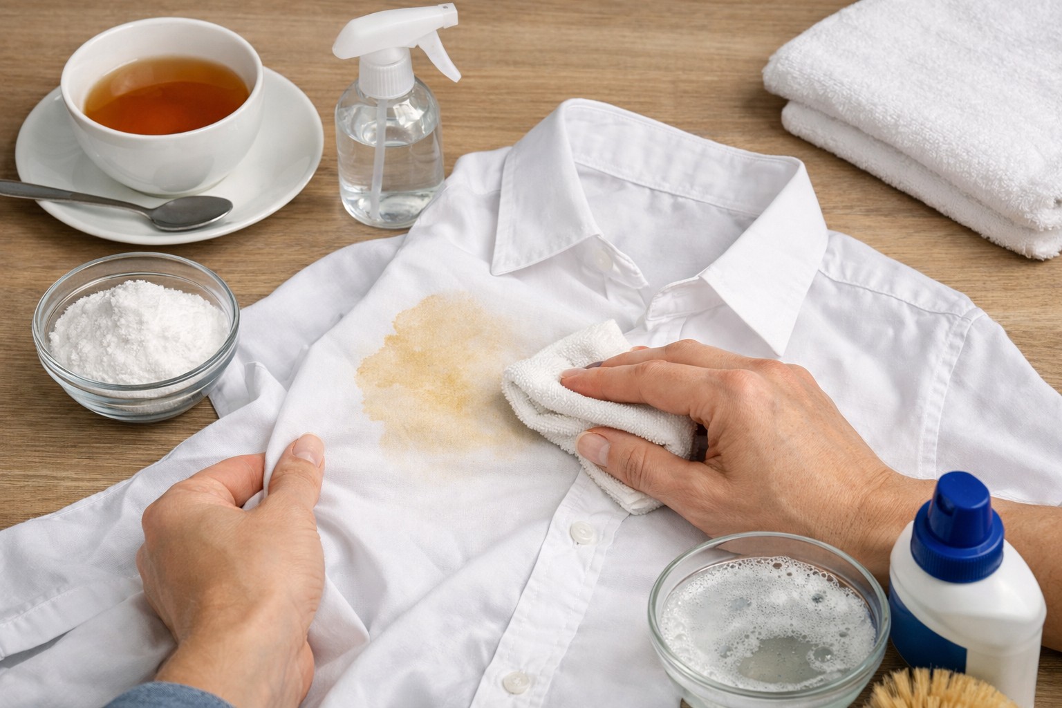 If trouble has just happened, the first thing you should do is blot off excess moisture with a dry cloth. White fabric requires special attention, since the tea pigment is most clearly visible on it.