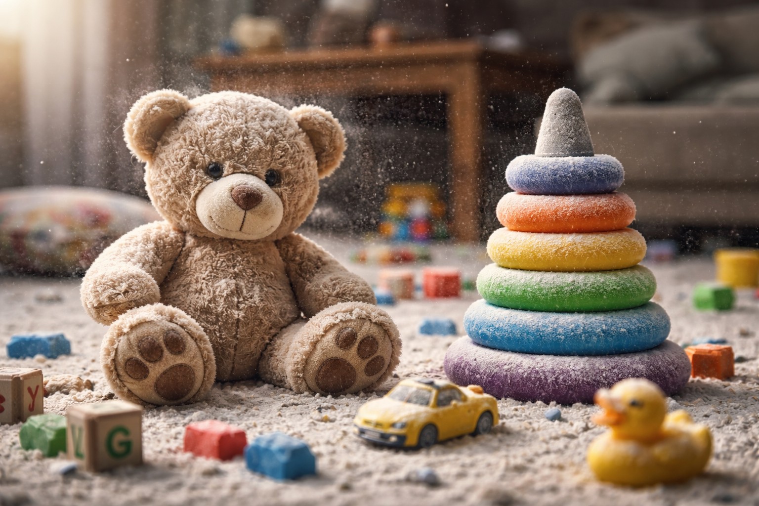 The main reason why toys actively collect pollution lies in the materials. Most modern products are made from synthetic fiberspolyester or plastic. These materials have the property of accumulating static charge at the slightest friction with air or other objects.