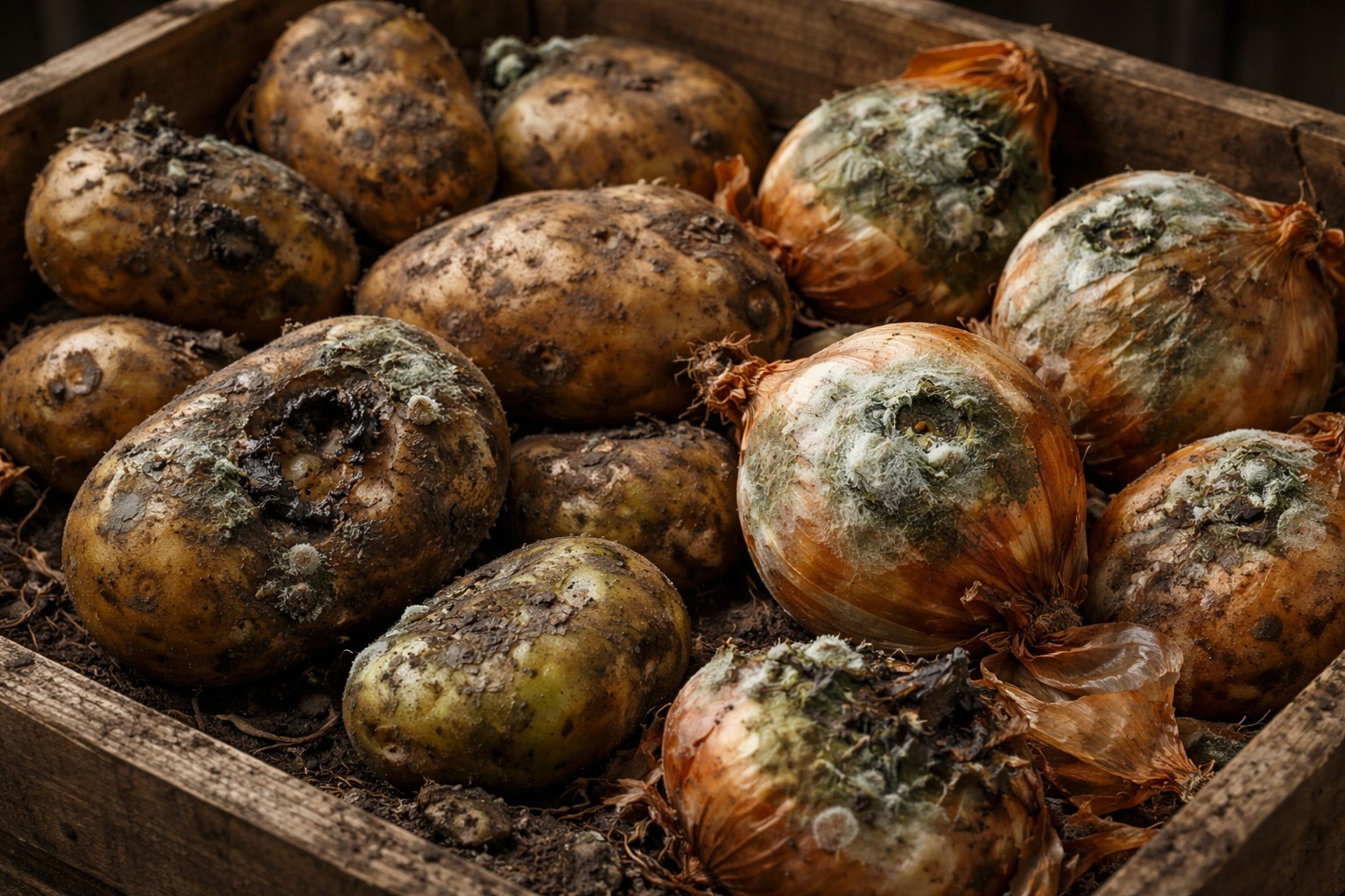 To preserve supplies for a long time, these vegetables must be kept in different containers or at least on different shelves. Potatoes do best in a cool, dark place in paper bags or wooden boxes, while onions do best in nets or baskets with airflow.