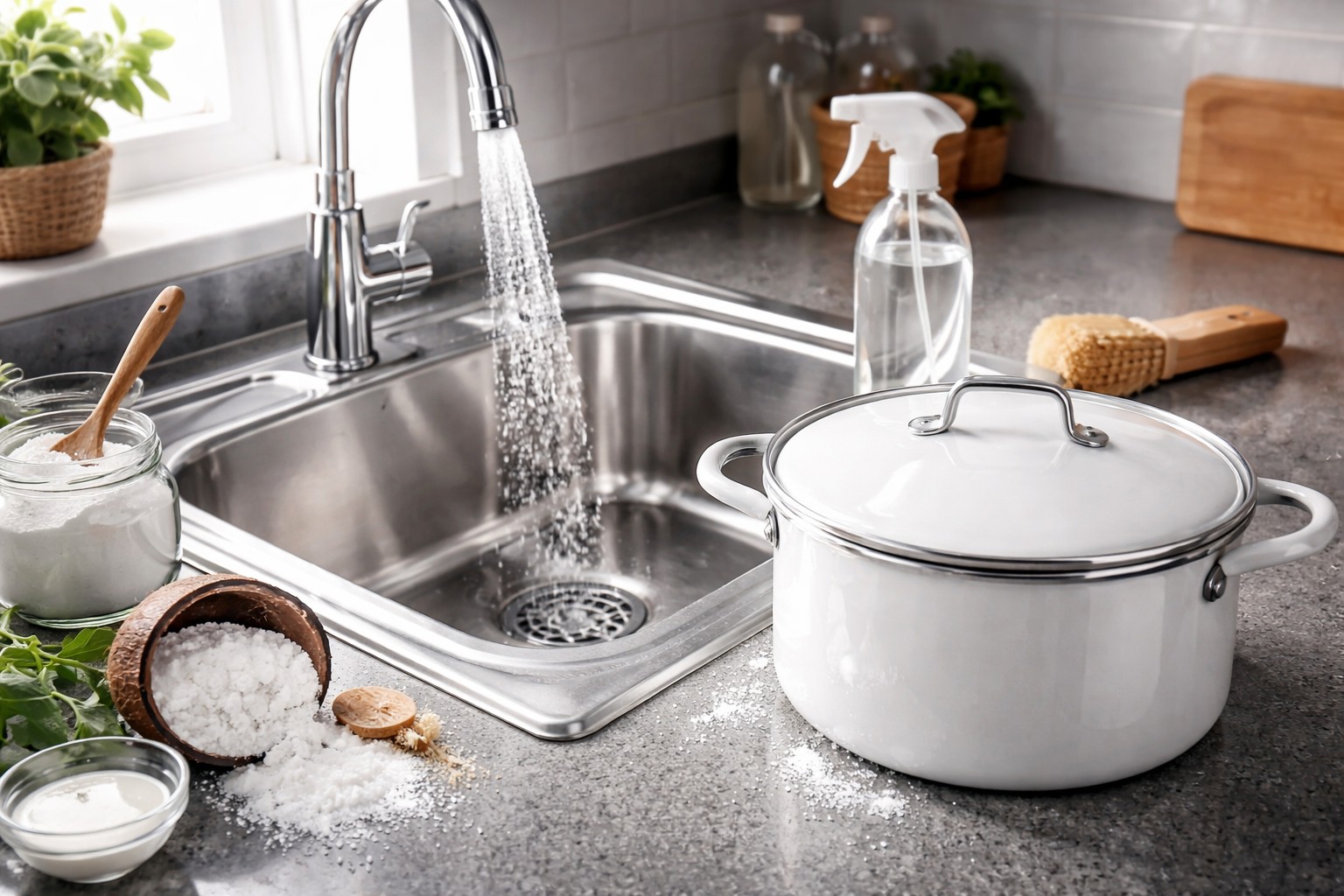 This combination works flawlessly thanks to a chemical reaction that literally “undermines” the dirt from the inside. The method is ideal for cleaning stainless steel and enamel surfaces from old grease and dark stains.