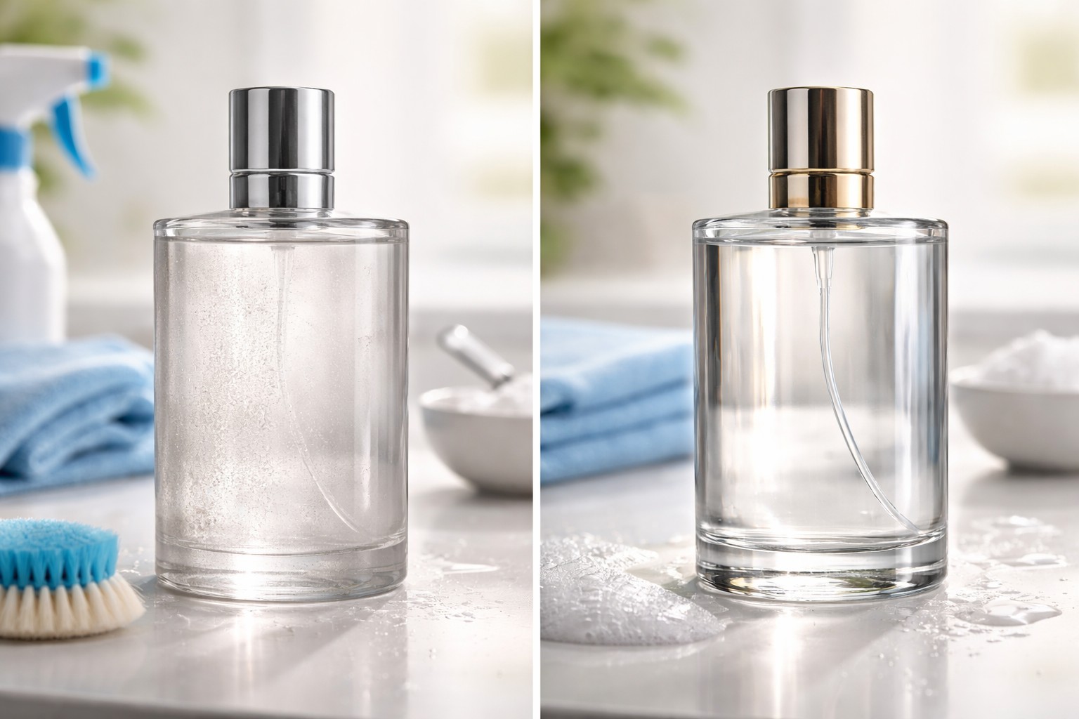 The most effective way to get into hard-to-reach areas inside curved glass is to use a natural abrasive. This method is ideal if there is still oily layer or dried perfume.