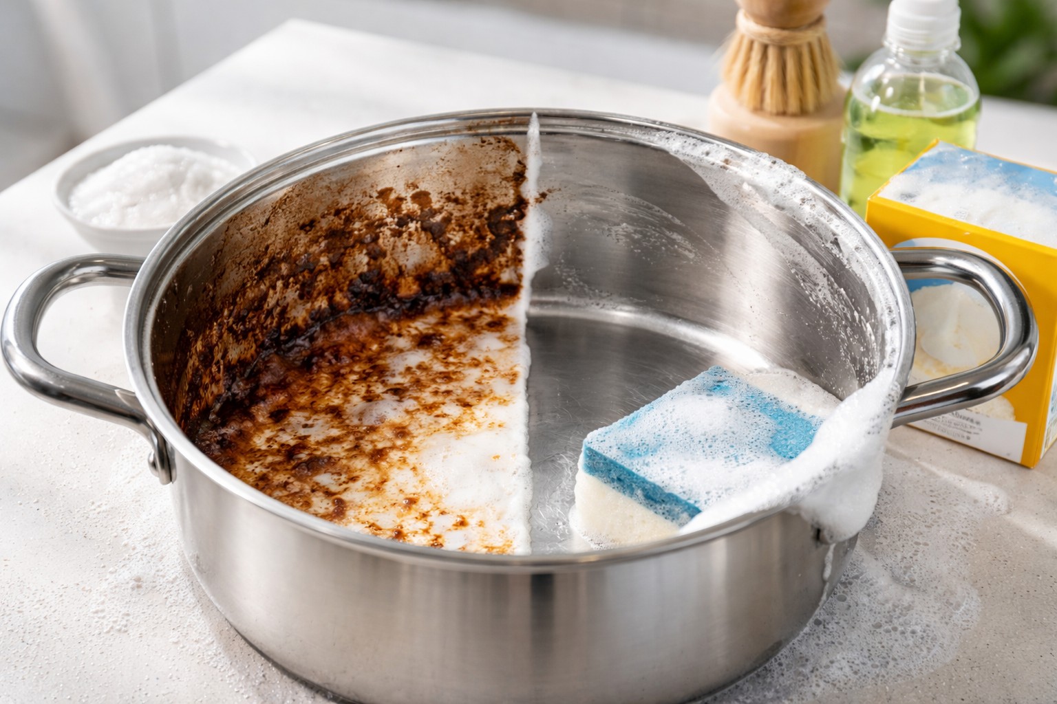 This is the most popular and safest method for any cookware, including enamel and aluminum. Soda reacts with fats and milk proteins, softening the burnt crust.