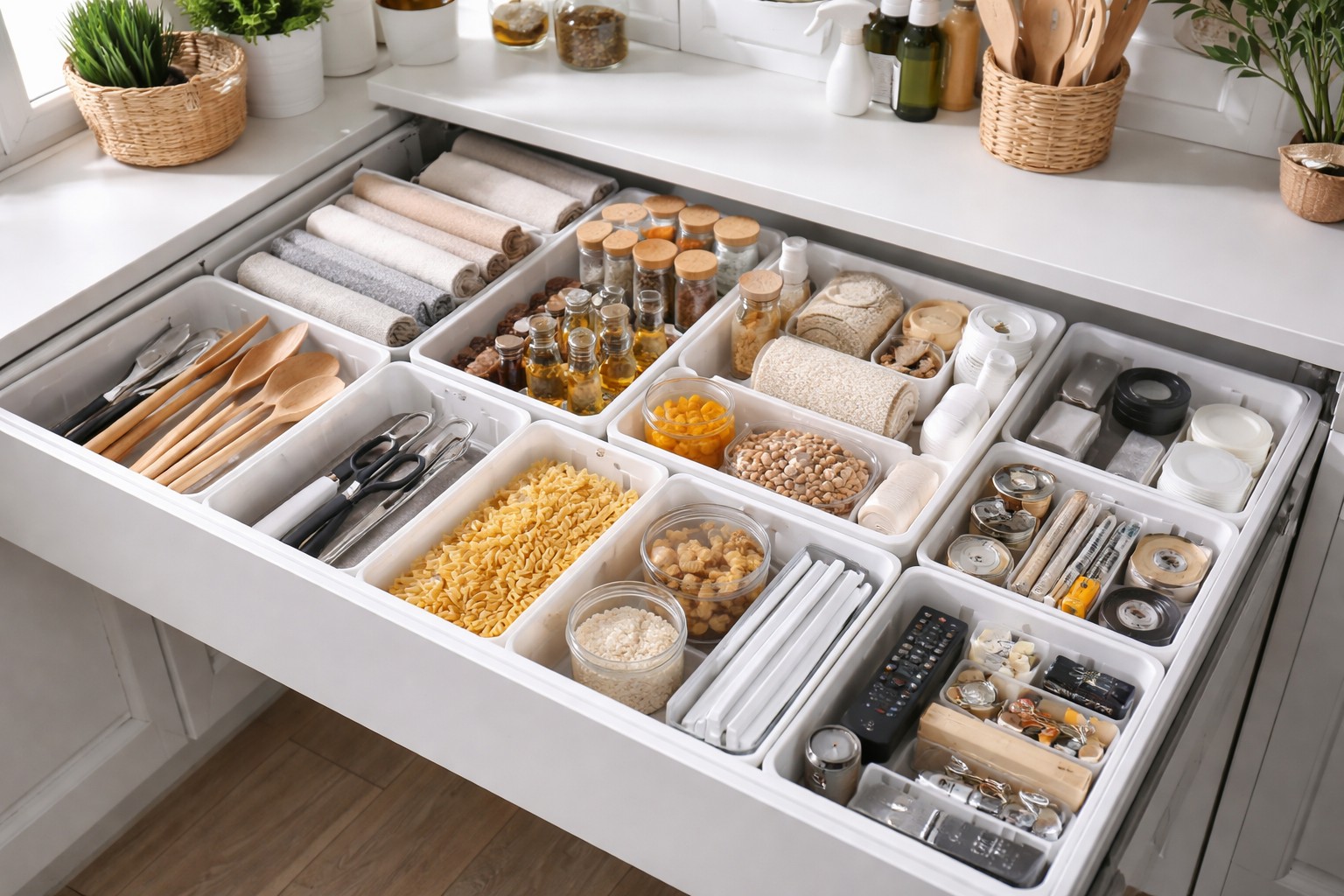 Zoning the space inside the drawers helps save time. Without dividers, the contents of the drawers are mixed every time they are opened. As a result, the search for the right thing turns into a quest. Trays fix objects in their places, preventing them from migrating. You stop spending minutes sorting through the contents, knowing exactly in which cell what you are looking for lies.