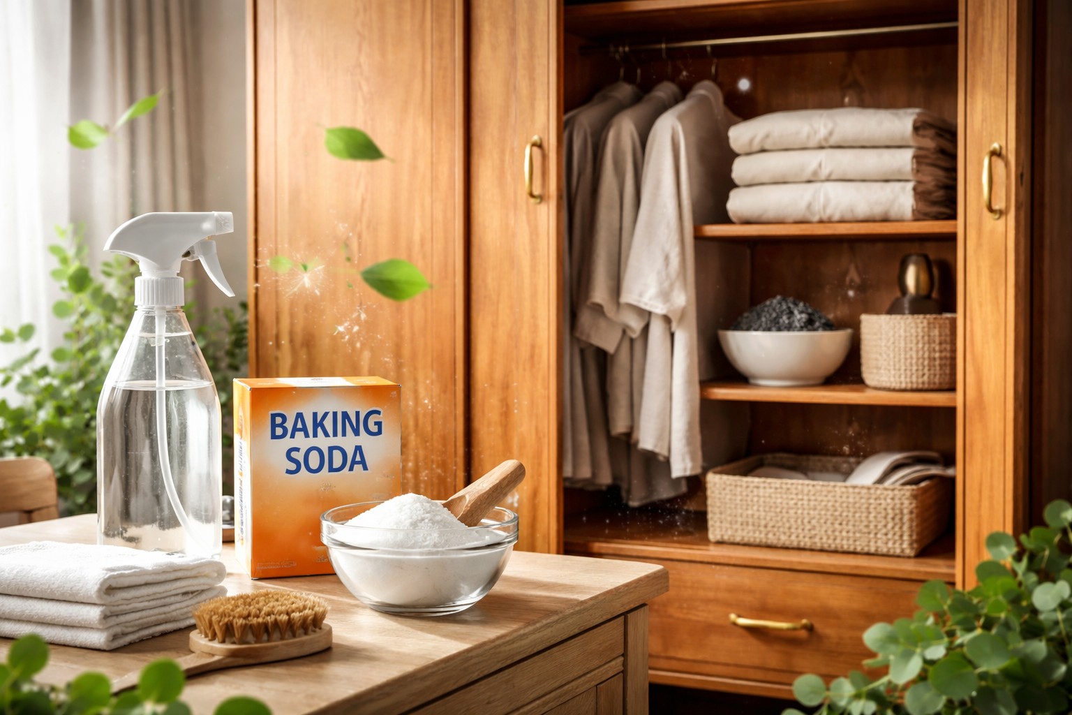 Activated carbon or ground coffee. Place small containers with these sorbents inside cabinets and chests of drawers. They perfectly absorb volatile odor molecules.